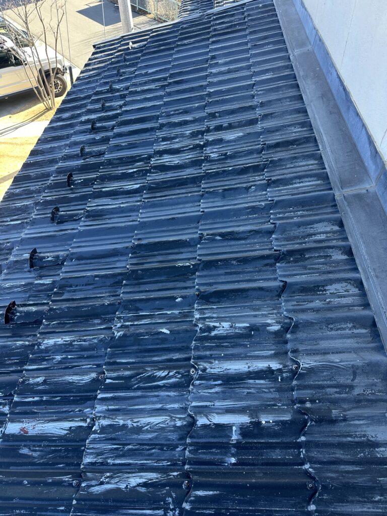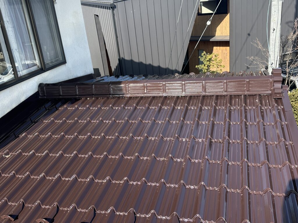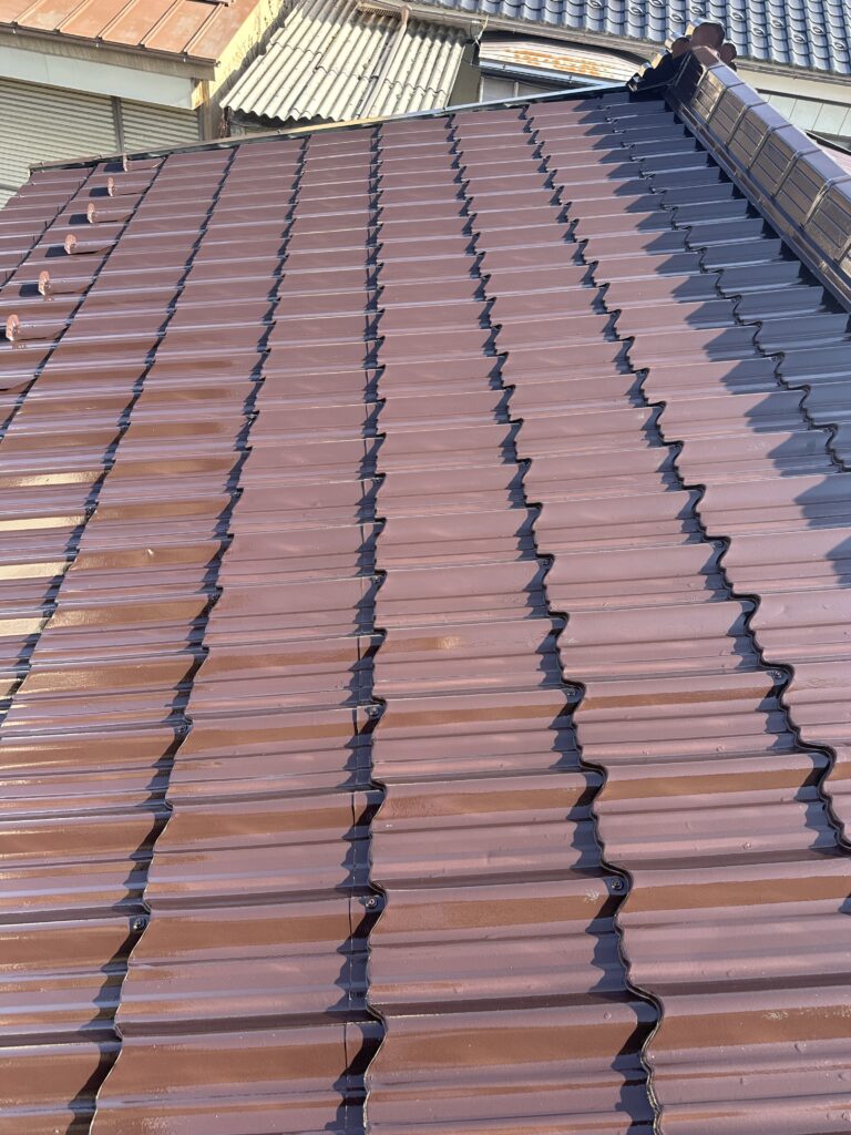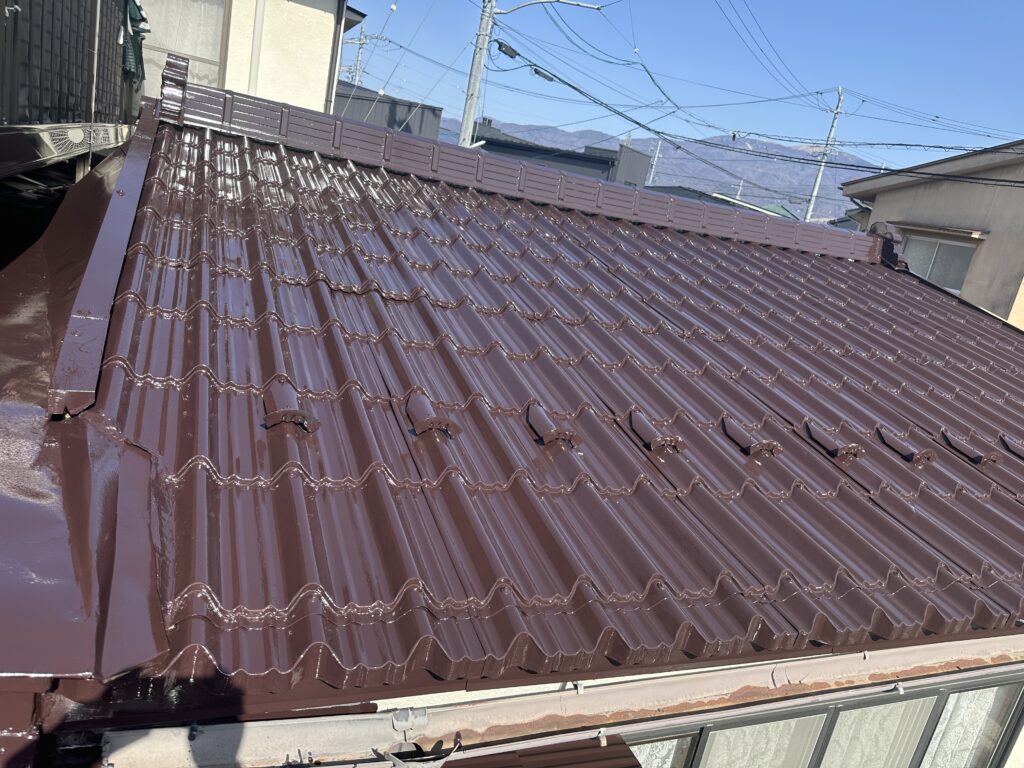 下屋根塗装(塩尻市) 2026-03-01 施工事例 #塩尻市#屋根塗装#長野県 塩尻市で下屋根の塗装をさせて頂きました。 日本ペイントのファインパーフェクトルーフを使用しました。 色はコーヒーブラウンです。 ケレンをしてから錆止め1回の上塗り2回の計3回塗りで仕上げました。 施主からピカピカになったと喜んで頂きました。 施工事例 #塩尻市#屋根塗装#長野県